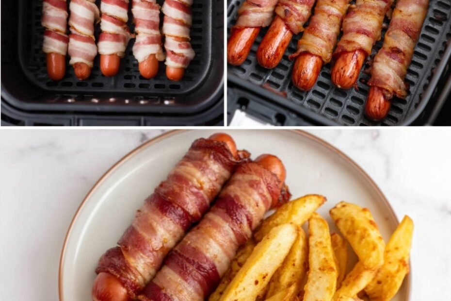 These air fryer chili cheese dogs are loaded, crispy, and insanely satisfying! Juicy hot dogs (optionally bacon-wrapped) topped with rich chili and melty cheese—ready fast with minimal mess.