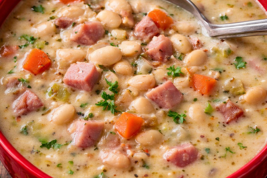 This Creamy Ham & Bean Soup is rich, hearty, and packed with comforting flavor. Tender beans, savory ham, and a creamy broth come together in the kind of meal that keeps everyone going back for just one more bowl.
