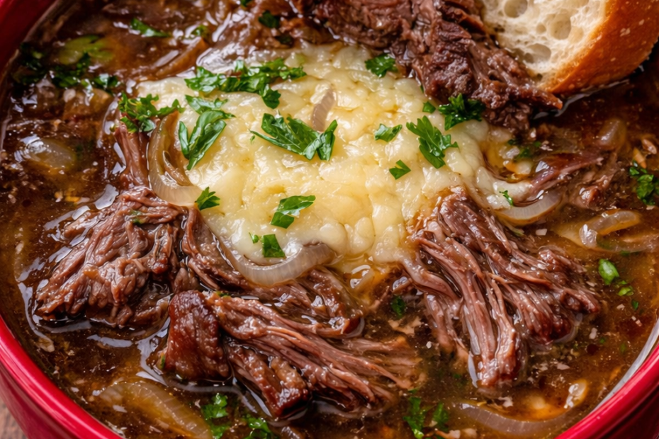 This French Onion Beef Soup takes everything you love about classic French onion soup and makes it even heartier with tender, juicy beef. Topped with melty cheese and toasted bread, it’s pure comfort in every bite.