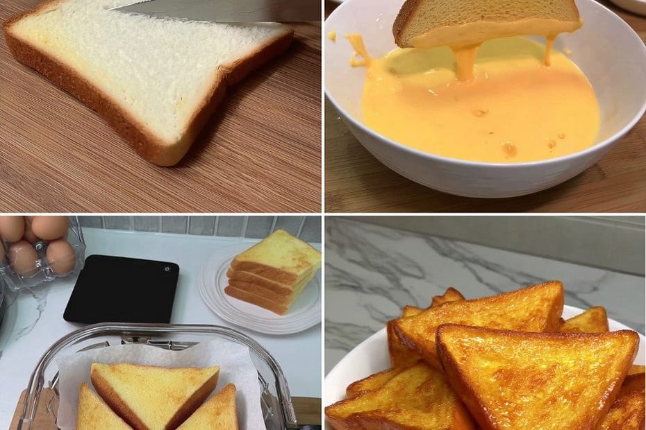 Dip each bread triangle into the egg mixture, making sure both sides are coated but not overly soaked.