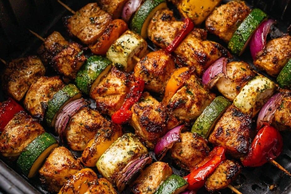 These Simple Chicken Kabobs in an Air Fryer are the perfect “throw it together and let it cook” meal. The air fryer gives the chicken a lightly seared exterior while keeping it juicy and tender, and the vegetables cook until soft but not mushy. Best of all, there’s no grill, no smoke, and almost no cleanup.
